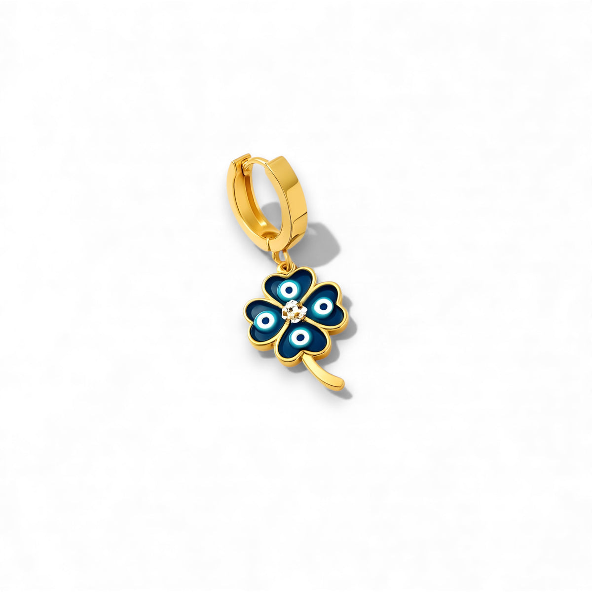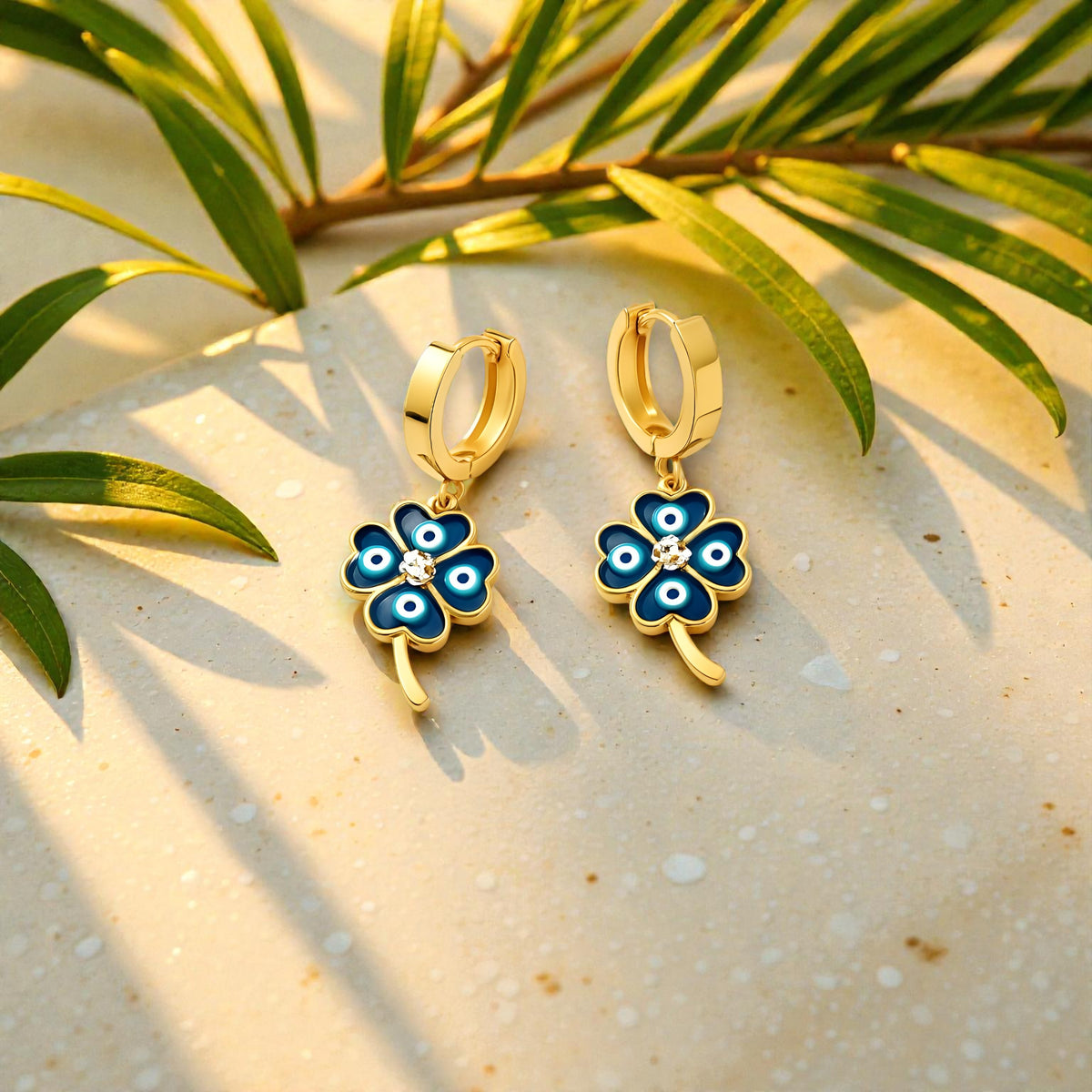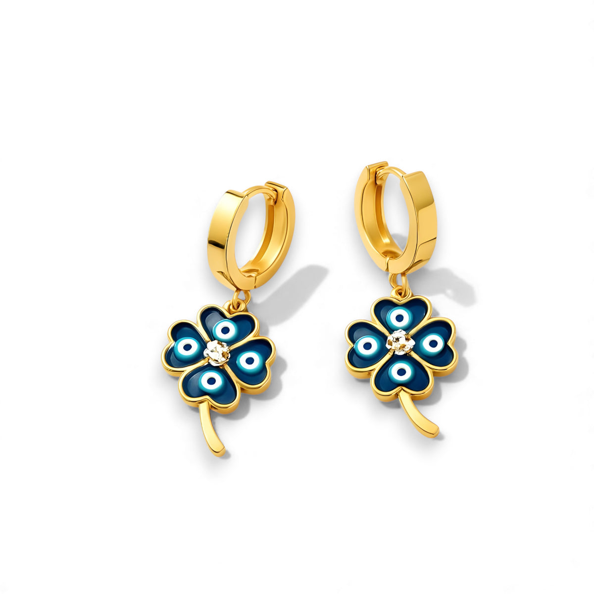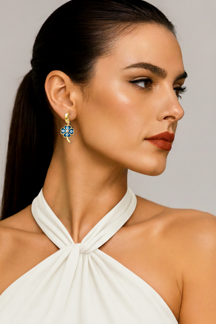 Each earring features a four-leaf clover, symbolizing luck, love, hope, and prosperity, paired with the timeless blue evil-eye charm known for protection and positive energy.