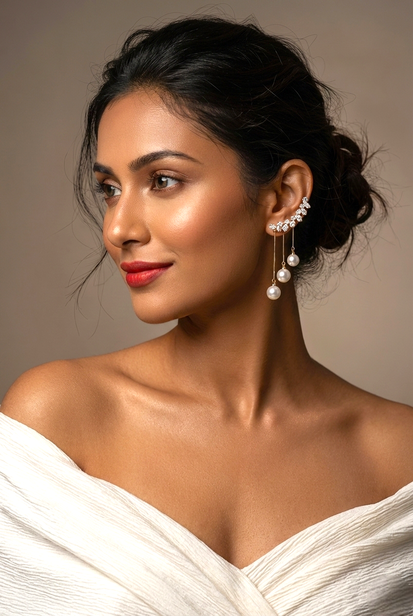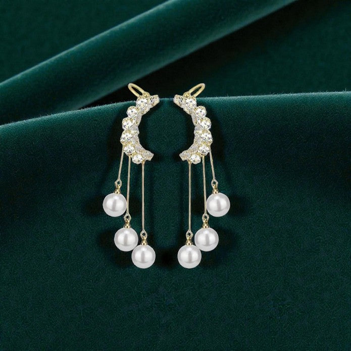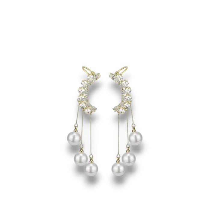 Inspired by timeless romance and graceful movement, Isolde Pearl earrings blend delicate sparkle with fluid elegance. A crescent of shimmering crystals curves softly along the ear, giving way to fine gold-toned strands adorned with luminous pearls that sway beautifully with every step. The cascading design creates a refined statement—lightweight, feminine, and effortlessly luxurious.
