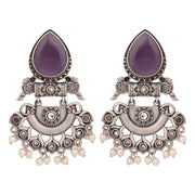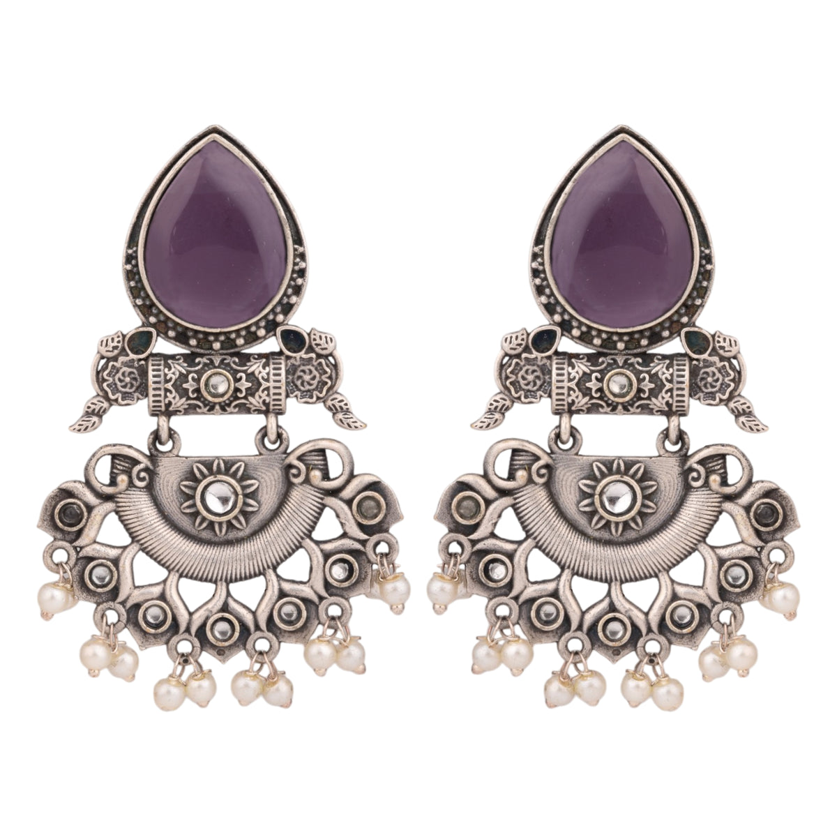 Elegantly crafted, these earrings feature a teardrop-shaped lavender stone atop intricate silver detailing with delicate pearl danglers. A perfect accessory to add a graceful touch to any traditional or festive attire.