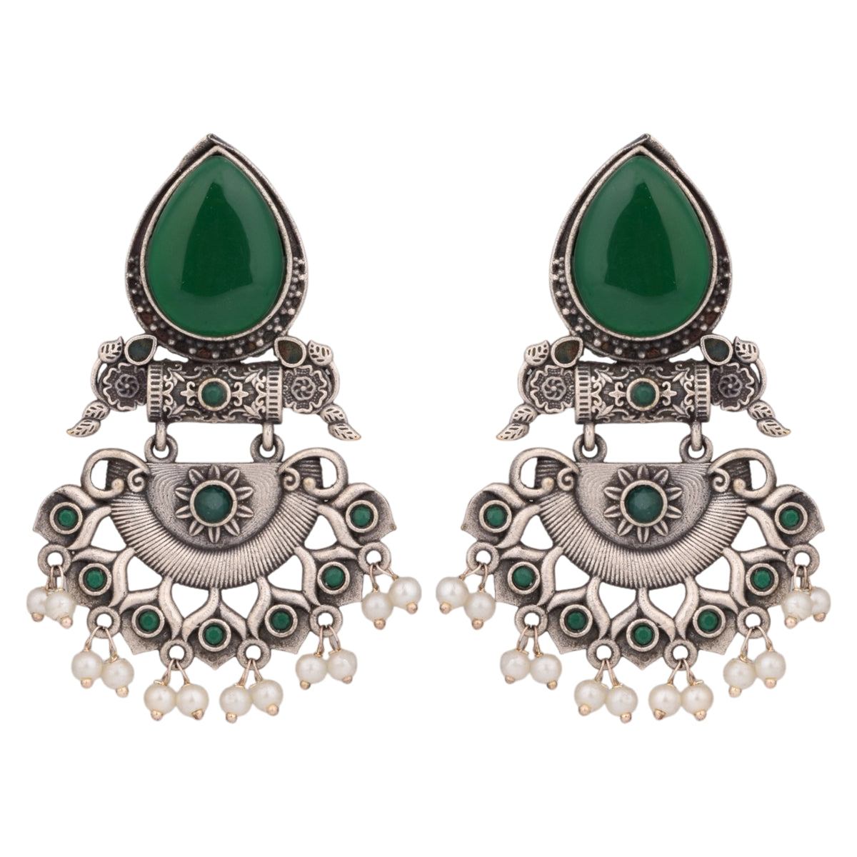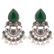 These oxidized silver earrings feature an elegant teardrop-shaped green stone accent and intricate detailing with tiny pearls. Their graceful design makes them a timeless addition to ethnic and festive ensembles.