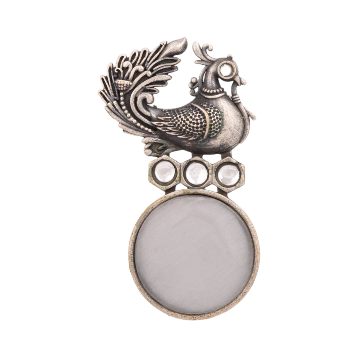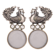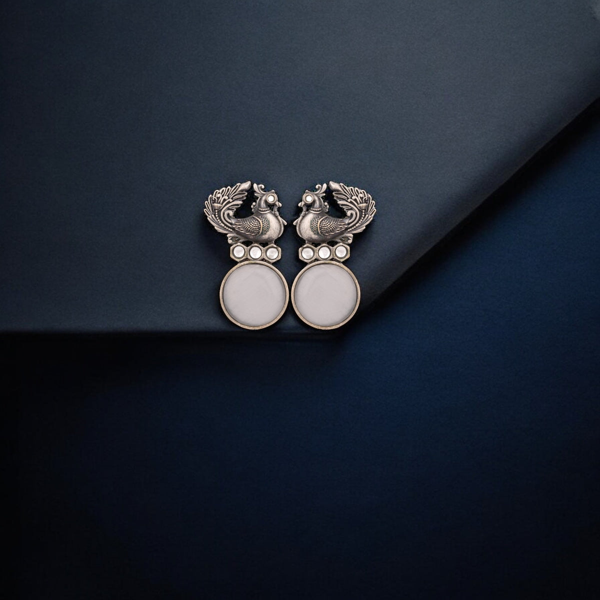 Regal and intricate, these oxidized silver earrings feature a majestic peacock motif perched above pearly circular drops. Accented with mirror details, they blend traditional artistry with timeless elegance.