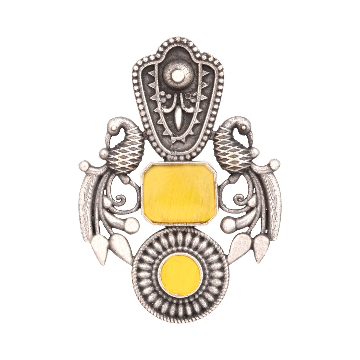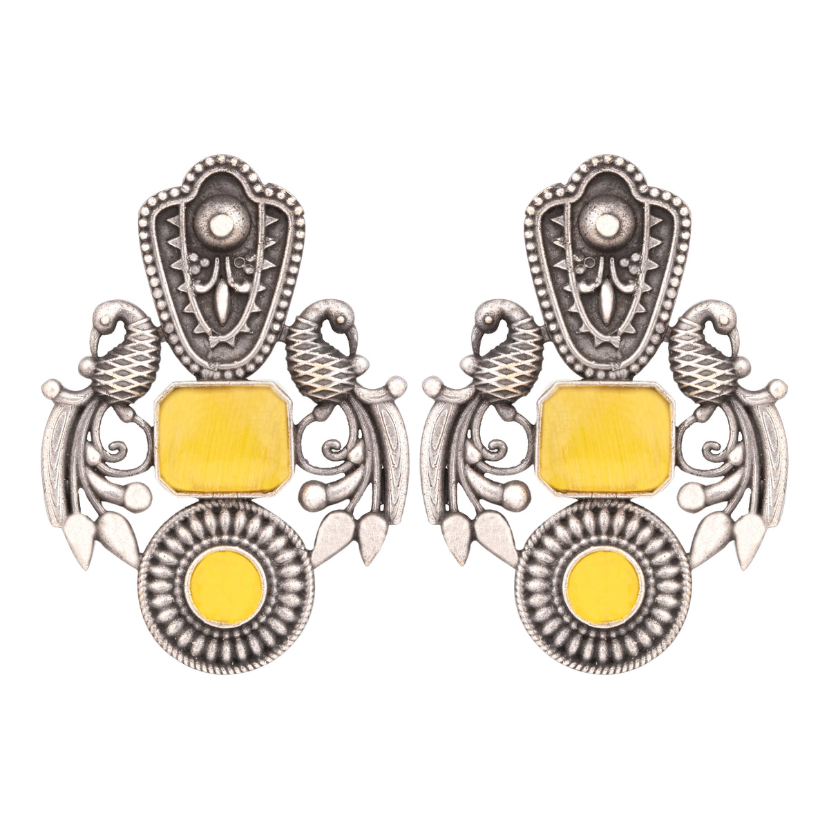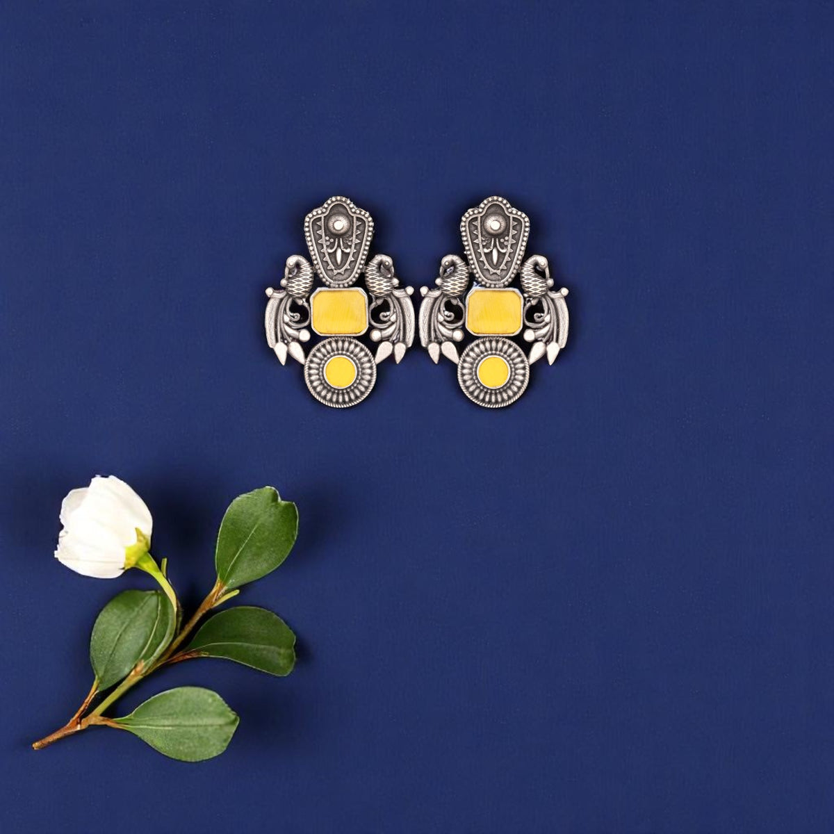 These oxidized silver earrings feature a vibrant yellow enamel centerpiece accented by floral and tribal motifs. A bold yet elegant design, perfect for adding a pop of color to ethnic or fusion outfits.