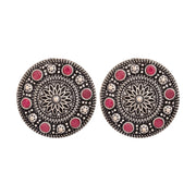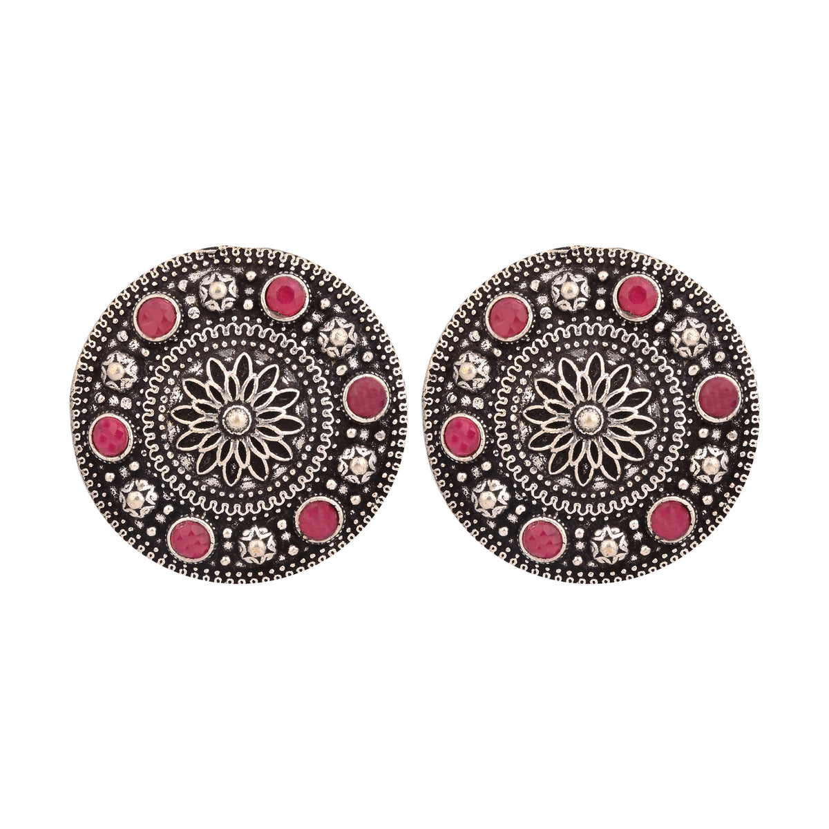 Antique-style round stud earrings with intricate floral detailing and vibrant pink accents. A timeless design that blends tradition with elegance for everyday wear.