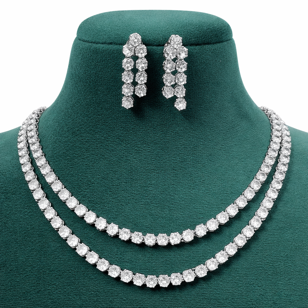 Eterna Luce is a refined double-layer necklace crafted to reflect everlasting light and effortless grace. Featuring two perfectly aligned rows of radiant stones set in a sleek silver finish, this design creates a luminous silhouette that rests beautifully along the collarbones. Designed for women who appreciate understated luxury, Eterna Luce adds depth, sparkle, and sophistication without ever feeling overpowering. Whether styled with an evening gown, festive wear, or an elevated everyday look, this necklace delivers a polished statement that remains...