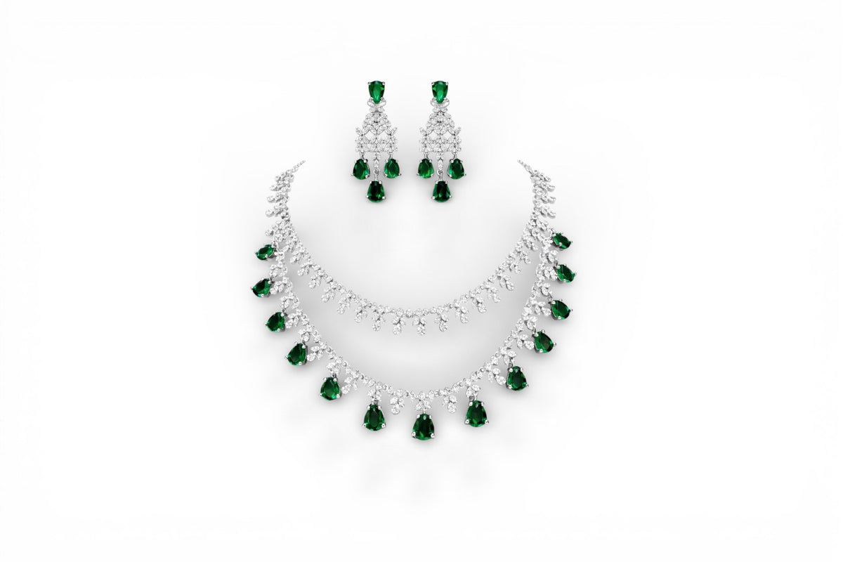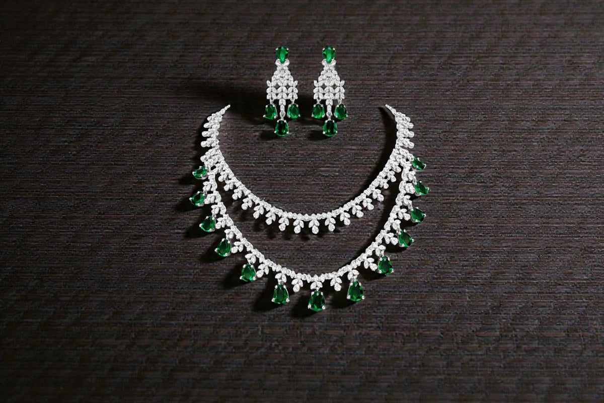 The Riwaayat Necklace Set is crafted for those who appreciate timeless Indian elegance with a refined modern touch. Designed with intricately set stones and graceful emerald-tone drops, this set adds a luxurious yet balanced presence to your look. The necklace sits comfortably along the collarbone, while the matching earrings complete the set with a harmonious finish. Its elegant proportions ensure the jewellery enhances your outfit without appearing oversized, offering a realistic and graceful wear experience. Perfect for weddings, festive occasions, and traditional celebrations, Riwaayat blends classic design with contemporary finesse — making it a versatile addition to any jewellery collection.