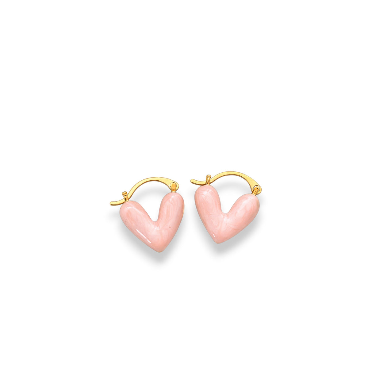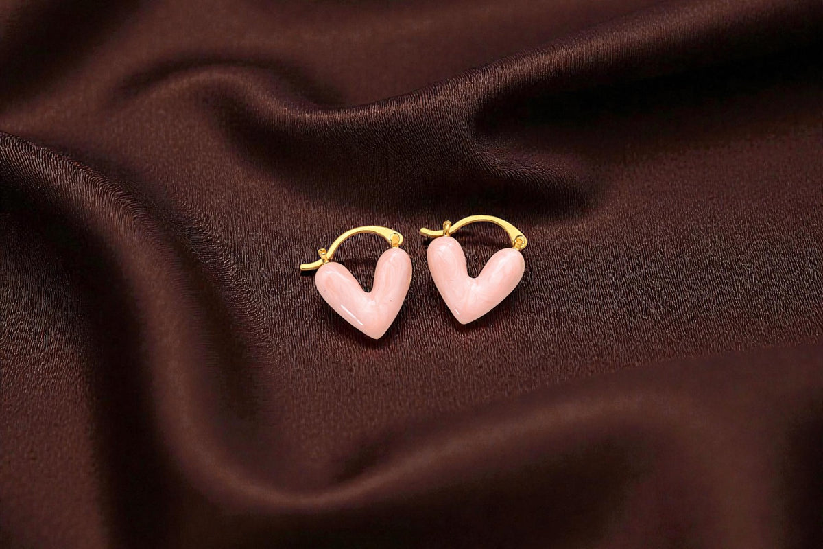Designed with a delicate pink heart stone and finished with a refined gold-toned huggie clasp, these earrings bring together warmth, femininity, and modern luxury.