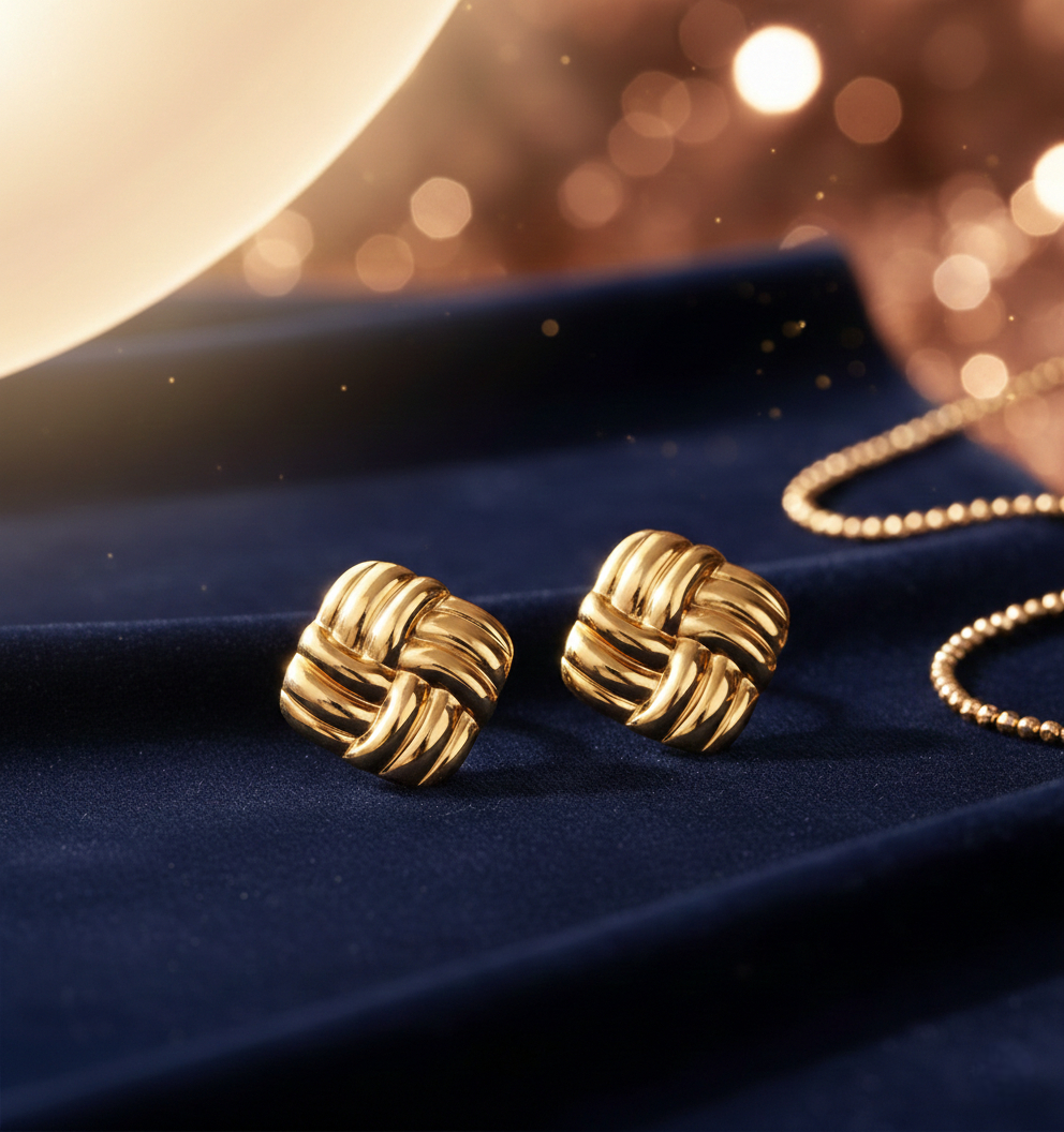 Minimal yet striking, Zeni Earrings are crafted for modern elegance and timeless appeal. Featuring a bold woven-knot design, these statement studs reflect refined craftsmanship and contemporary luxury. Finished in 18K gold plating, they offer a radiant, long-lasting shine with a premium feel.